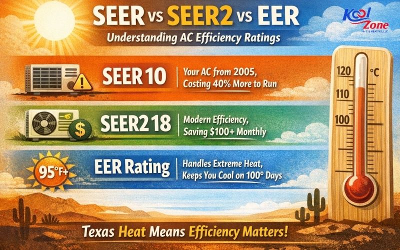 If you’re comparing AC systems or staring at your electricity bill wondering why your old unit is costing a small fortune, you’ve probably stumbled across confusing acronyms like SEER, SEER2, and EER. Let’s be honest, when you’re sweating through another brutal Tomball summer where the heat index hits 110°F, you just want cold air now. Technical specifications are the last thing on your mind when you can barely sleep at night.
